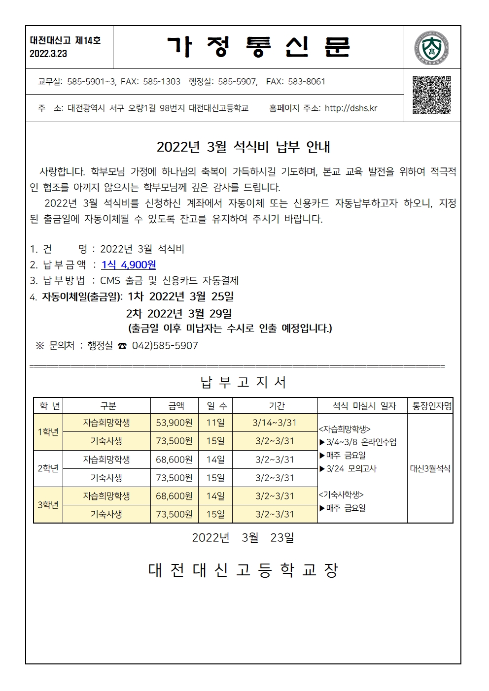 2022년 3월 석식비 납부안내